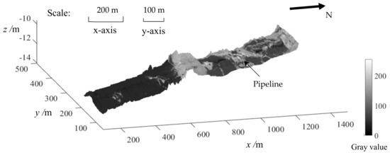 To validate the proposed method, an experiment was carried out in Meizhou Bay, China with the area of 1.4 × 0.3 km. In this water area, the depth ranges from 10 to 14 m; seabed sampling showed sediments mainly contain silt and sand. In this experiment, EdgeTech 4100P with the slant range of 112 m and 7502 sampling points for each ping was adopted for the SSS measurement. For the MBES measurement, EM 3002 with a maximum angular sector of 130° and 131 beams was adopted. The MBES data were collected using the Seabed Information System (SIS) and restored in “*.all” files. The SSS data were collected using the EdgeTech Discover Software and restored in “*.xtf” files. After collecting these data, both SSS and MBES data were processed by self-developed software. The processing of SSS and MBES data is shown in Figure 3. After data processing, the geocoded SSS backscatter image, MBES image and seabed topography were created, as shown in Figure 5a–c. The coordinates are in WGS84. Considering the sensitivity of geographical data, the coordinates have been subtracted by a constant. Meanwhile, the MBES and SSS backscatter images and the MBES topography were resampled in the same ground sample distance (GSD) of 1m. Even with the same GSD, the SSS backscatter image could reflect clearer contours of seabed surface features because there exist many more sampling points for one ping of the SSS measurement than that of the MBES measurement. For example, the pipeline is presented more clearly in the SSS backscatter image than in the MBES image. Meanwhile, the topography shown in Figure 5c mainly reflects the 3D seabed undulations but with less detail.