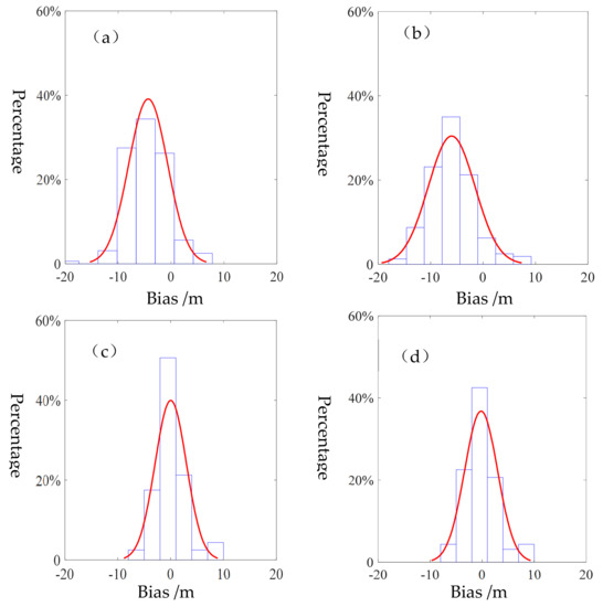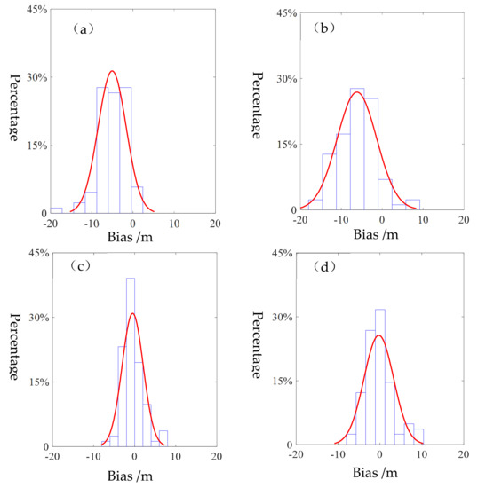 The probability distribution function (PDF) curves of interior checking. (a) and (c) are PDF curves of coordinate biases in y direction before and after rectification; (b) and (d) are those of coordinate biases in x direction.