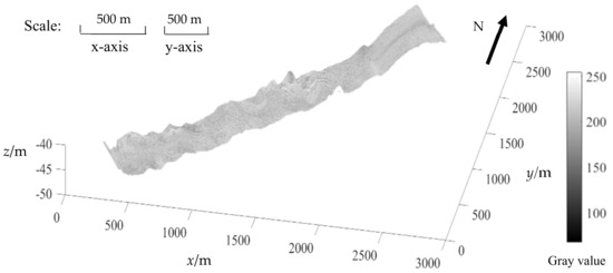 (3) According to the geographic coordinates, each grid point of the 3D topography was attributed with the corresponding grey value of SSS backscatter image.