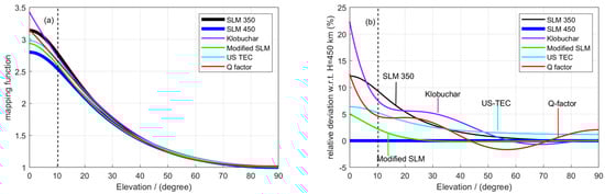 Mapping Functions (MFs) against elevation (a). The relative deviation with reference to SLM-450 (b).