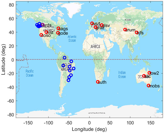 Geographic distribution of the 14 processed stations in red circles were used to estimate satellite and receiver DCBs. Two regions of Western Canada and South America in blue circles were selected to evaluate mapping errors.