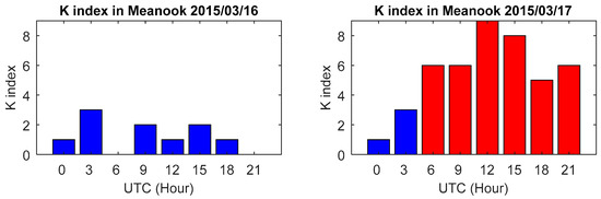 K index on March 16 and 17, 2015 in Meanook (54.62°N, 246.65°E).