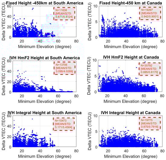 Figure 7 presents the mapping errors against the lower elevation of two CPPs for two regions of South America and Western Canada. The left column is for South America, and the right column is for Western Canada. It can be seen that the mapping errors in Western Canada were about six times smaller than those of South America. This is because at the lower latitude larger ionospheric gradients caused larger mapping errors. Comparing the heights, we can see that mapping errors using integral height were smaller than those using the fixed height of 450 km. The enhancement is about 9.4% in Western Canada, and 7.4% in South America when we use root mean square as criteria. However, mapping errors using HmF2 presented a different scale in Western Canada (7.5%) and South America (37.5%). We can see that the HmF2 generate smaller mapping errors at low latitude and the integral height has smaller mapping errors at middle latitude.