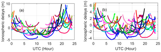 Ionospheric observables using the uncombined precise point positioning (UPPP) model on March 16 (a) and 17 (b), 2015. The ionospheric observables from a satellite correspond to one color.