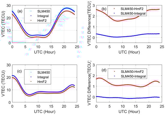 For the integral height, the differences between the integral height and SLM450 were within 0.5 TECU, significantly smaller than those of the HmF2. And the value could be positive and negative for the integral height on both days.