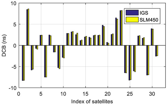 Satellite DCB estimated using the fixed height of 450 km compared with IGS products on 17 March 2015.