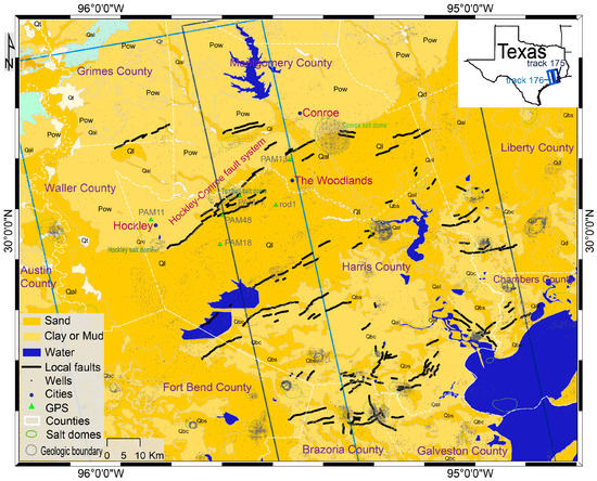 GH lies largely in the smooth and low-lying Gulf coastal plain with elevation gradually rising inland from about 0 to 110 m. The east and north GH are densely forested, while the west and south parts are mainly covered with prairie grassland, and the coastal regions are covered in prairie and sand [1]. The surficial geology of GH is complex, largely constituted by poorly-cemented sands, clay shales and unconsolidated clays, into few kilometers deep. Figure 1 shows the geological map of GH [8]. GH is underlain by sediment deposited along Gulf of Mexico during the Cenozoic era; large amounts of unconsolidated sands and sandy clays were deposited throughout the Pleistocene and Holocene periods [1]. Both the Lissie Formation and the Beaumont Formation are part of the Houston lithology, and the Willis Formation underlies uncomfortably the Lissie Formation stratigraphically. The older Pleistocene Willis Formation mainly contains clays with less volume of sands and silts. The Pleistocene Lissie formation is primarily composed of sands with fewer silts and clays, while the Beaumont formation is comprised of finer clays with silt [8,62]. The contacts regions among formations are usually with the characteristic of low cohesion and will be easily to turn into normal faults, and many faults of the GH region lie at the contact of these two formations, according to the geologic map (Figure 1). For example, the Hockley fault within the Hockley-Conroe fault system lies along the contact of the Willis (clay-dominated) upper lithologic unit at the upthrown block, with the Lissie (sand-dominated) upper unit on the downthrown side of the fault [3,23,34].
