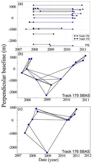 SAR interferograms spatial-temporal baseline distributions: (a) shows PS-InSAR (single master) interferograms of both two tracks: blue segments indicate 11 interferograms generated by ALOS path 175, with 20071227 as the master image; black segments represent 10 interferograms generated by ALOS path 176, with 20100605 as the master image; (b,c) SBAS (multiple master) interferograms with temporal and perpendicular baseline thresholds of 350 days and 1200 m, respectively.