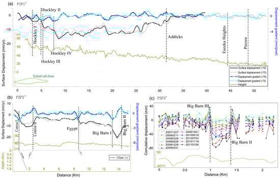 Figure 4 shows profiles of the LOS annual displacement (a,b) and cumulative displacement (c) along the cross-fault lines of P#P#’ marked on Figure 3a. Sharp displacement gradient changes or discontinuous are evident across a majority of faults, and two sides of a fault normally have different surface displacements (Figure 4). Fault activities during 2007–2011 are not as significant as that before 2000 at the Long Point fault system and Addicks fault system, and [53] concluded that the rate of creep is about 10–15 mm/yr. The faults in the northern Greater-Houston were still active, with a creep rate of 10–20 mm/yr at Hockley fault system and about 10 mm/yr at the Conroe fault system (Figure 4).