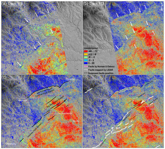 Enlarged deformation maps over northwestern Houston, whose location is outlined by pink dashed rectangles in Figure 3, from two adjacent ALOS-1 paths: (a) Path 176; (b) Path 175; (c,d) Both Path 175 and Path 176. The white arrows in (a) and (b) represent zones of high deformation velocity gradient (differential movement). White lines represent the faults mapped by LiDAR [10] and pink dashed lines show the faults published by Norman and Elsbury (1991), while newly revealed fractures by our Multi-temporal InSAR (MTI) processing are in black lines. The purple boxes in (c) indicate the three discovered faults systems, while the middle one (the same as the bottom purple box in (d)) is also used for InSAR results validation in Figure 6b. The top purple box in (d) shows an area that will be used for fault activity model analysis in Section 5. The colored stars in (c) and (d) mark positions for field survey and validation in Figure 6a,c–g.