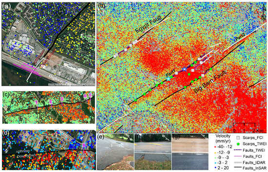 The Big Barn fault was first mentioned in a field investigation guide book by the Houston Geological Society [80]. Fugro Consultants, Inc. (FCI) [31] and Tolunay-Wong Engineers, Inc (TWEI) [32] acknowledged the presence of faulting and mapped where the faulting occurred through their field investigations over the Big Barn Fault System. Figure 6b shows enlarged InSAR-derived deformation, where supposed fault traces, LiDAR-mapped faults and faults imaged by FCI and TWEI are superimposed. The dots show some surface scarps published by FCI and TWEI through their geological survey for the purpose of designing network of water pipelines. All published faults’ information is consistent with the InSAR-mapped fault traces at either Big Barn fault or Egypt fault (Figure 6b). The authors of [37] conducted an integrated geophysical investigation of the Big Barn fault, including the use of electrical resistivity and gravity techniques, to delineate the fault and define the geology of the upper rock units. Six of the seven field sites in their study were superimposed onto the enlarged InSAR deformation map, and sharp contrasts in InSAR deformation map from the upthrown side (smaller deformation) of the fault to the downthrown side (larger deformation) are evident at all the field sites (Figure 6c,d). Thus we confirmed that the discontinuities in the MTI-derived InSAR images do correspond to the surface ruptures. All geophysical techniques showed the different lithology features of two sides of the fault, i.e., Lissie Sand in higher accumulation on the faults’ downthrown blocks and the Willis Clay in higher accumulation on the upthrown sides. The authors of [37] regarded these truncation features as normal faulting.