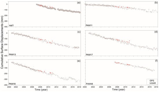 Comparison between InSAR-mapped time-series ground surface displacement and GPS observations at 6 stations.