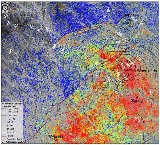 Groundwater withdrawal from the Jasper aquifer has been increasing since 2000 as urban growth spreads northward, especially the extensive urban development in Montgomery County, and the total groundwater withdrawal continuously increased from 7.84 MG/d in 1976 to 43.6 MG/d in 2000, and then to 64.2 MG/d By 2010 [103]. As a result, groundwater levels rose by 60 m in both the top two aquifers (i.e., Evangeline and Chicot aquifers), while groundwater levels declined by 60 m in the Jasper aquifer system from 1976 to 2015, and formed new water-level decline/subsidence cones over northern GH. The rate of faults slip dropped to about 5–20 mm/yr along the Addicks fault system and Long Point fault system from 2005 to 2011 on account of the uplifted groundwater level in Harris County and the subsidence cones migrated northward. Faulting receded or ceased in the water-level recovered areas with stable or uplift deformation, but sustain unabated over the ongoing subsidence areas with continued groundwater level declines, i.e., Hockley fault system. Reports from local residents in The Woodlands area claimed property damage due to faulting that has become more evident during the last decade (e.g., [31,47]). Faulting activities were in connection with the spatial distribution and density of water-level decline and ground subsidence. Figure 9 compares the groundwater level changes of the Jasper aquifer for the period 2000–2011 with the InSAR-derived deformation rate during 2007–2011. Subsidence near The Woodlands, where groundwater level declined most in a decade and Big Barn Fault System lies, is highly correlated with the spatial pattern of groundwater level declines (Figure 9). Not merely does accelerate activity of faulting in the time of excessive pumping of groundwater, but also the differential movements along faults in the region with maximum decline of piezometric surface are more significant than that within areas with lesser piezometric decline.