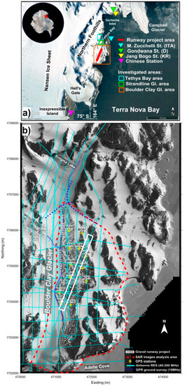 Urbini, S.; Bianchi-Fasani, G.; Mazzanti, P.; Rocca, A.; Vittuari, L.; Zanutta, A.; Girelli, V.A.; Serafini, M.; Zirizzotti, A.; Frezzotti, M. Multi-Temporal Investigation of the Boulder Clay Glacier and Northern Foothills (Victoria Land, Antarctica) by Integrated Surveying Techniques. Remote Sens. 2019, 11, 1501. https://doi.org/10.3390/rs11121501
