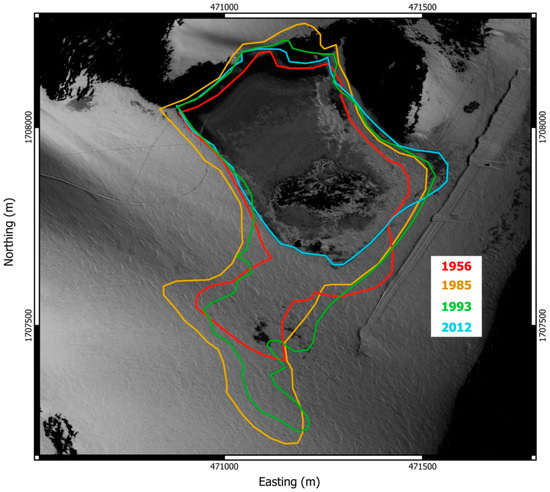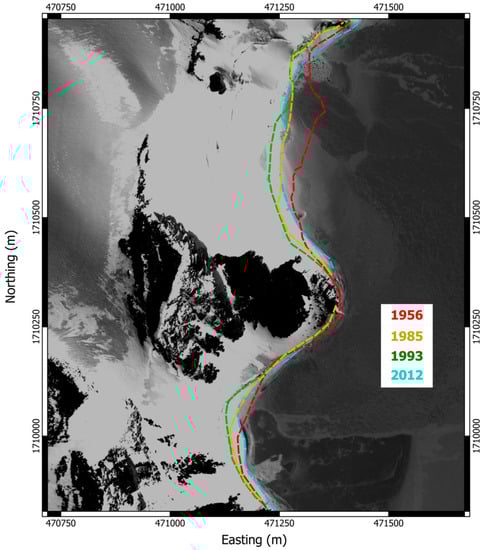 - Photogrammetry: to generate multi-temporal digital ortho-mosaics based both on available historical aerial images (1956, 1985, and 1993), and Very High Resolution (VHR) satellite stereo images acquired in 2012. Photogrammetry was applied even for the production of the reference map (high-resolution digital orthophoto), obtained through a photogrammetric process of stereopairs of satellite images using a set of Ground Control Points (GCPs) measured through a geodetic rapid-static GPS surveying technique. Data were integrated by a detailed Digital Terrain Model (DTM) of the BCG, obtained through a Terrestrial Laser Scanning (TLS) survey [9];