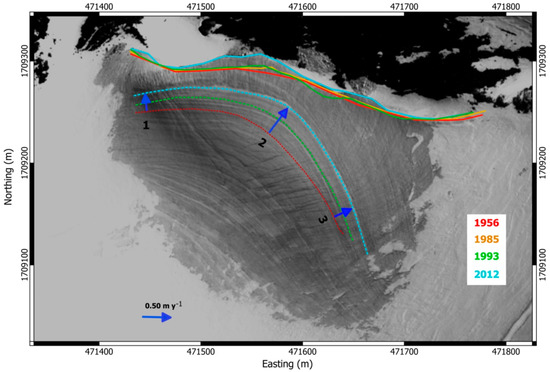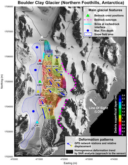 - Glacier: the surface-displacement rate deducted from the analysis was up to 1 m y−1 in the higher slope area close two Adelie Cove along the low signal stability (LOS; Figure 12a,b);