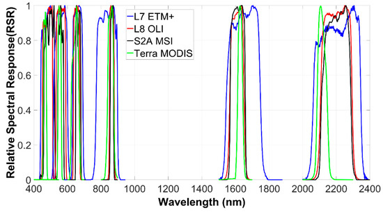 The MODIS is a key instrument onboard the Terra and Aqua satellites operated as a part of NASA’s (National Aeronautics and Space Administration) Earth Observing System. MODIS data is used for a wide range of applications such as ocean, land, atmosphere and climate monitoring. It has operated successfully on-board for the last 19 years. For Terra MODIS TOA reflectance products, a calibration uncertainty of approximately ±2% has been estimated [3,25]. The MODIS instrument acquires data at three spatial resolutions—250 m, 500 m and 1 km, which are coarser than the other sensors used in the study. In contrast, MODIS presents the highest temporal resolution (near-daily revisit acquisition capability).