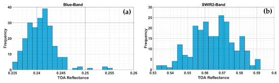 Mendes and Pala (2003) [40], studied the power of three normality tests. According to the authors Shapiro-Wilk was the most powerful test regardless of distribution and sample size and they recommend it to be used when testing for normality. In addition, in a more recent study, Yap and Sim (2011) [41], compared the power of eight normality test based on Monte Carlo simulation. According to their study, the results show that Shapiro–Wilk test is a powerful test regardless of distribution (symmetric short-tailed, symmetric long-tailed or asymmetric distributions). That is why this test was performed to determine whether the BRDF-corrected mean TOA reflectance values for each sensor and site represent samples obtained from a normally distributed population. Figure 3a,b, respectively, show the histograms of ETM+ Blue and SWIR2 band TOA reflectance obtained for Libya 4. Visual inspection of these histograms shows the appearance of a right-skewed tail in the Blue band histogram and a slight left-skewed tail in the SWIR2 band histogram, suggesting a non-normal distribution. This hypothesis is confirmed with the Shapiro-Wilk test results for all ETM+ bands from Libya 4, indicating the data are not normally distributed. The MODIS and MSI test results indicate their data are not normally distributed in some bands for this site. Interestingly, the OLI test results indicate its data are normally distributed in all bands. The particular Shapiro-Wilk results for each band using the Libya 4 data are summarized in Table 6.