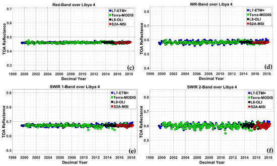 Temporal trend of BRDF-corrected Scaling Adjusted TOA reflectance over Libya 4 site (L7 ETM+, Terra MODIS, L8-OLI, S2A-MSI) in (a) blue band; (b) Green band; (c) Red band; (d) NIR band; (e) SWIR 1 band; (f) SWIR 2 band.