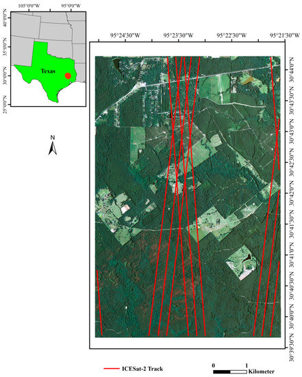The study was carried out in Sam Houston National Forest (SHNF) located in south-east Texas, USA (Latitude 30°42′N, Longitude 95°23′W). Elevations range from 62 m to 105 m, with an average of 85 m [8]. Approximately 58% of the region or 80% of its forested area (NLCD classes—deciduous forest, evergreen forest, mixed forest, and woody wetland) is classified as evergreen forests [42] and the site is predominated by pine forests, which include Loblolly pine (Pinus taeda) plantations and old growth Loblolly pine stands [8]. The planned ICESat-2 track locations for the first two years of the mission over the study area [31] are depicted in Figure 1.