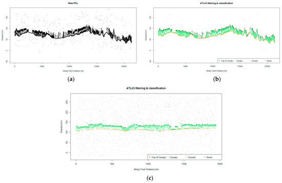 (a) Actual ICESat-2 data over pine forests in Texas; (b) Filtered and classified ICESat-2 data over pine forests in Texas; (c) Filtered and classified simulated ICESat-2 data in SHNF.