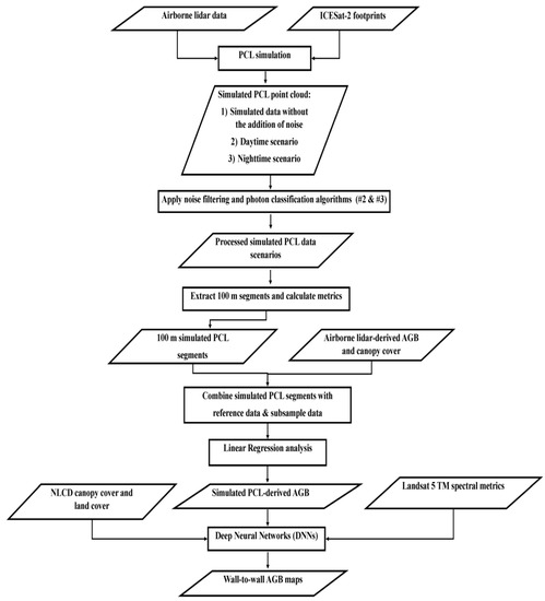 Using AGB models developed with the simulated PCL vegetation product over SHNF, AGB density (Mg/ha) was estimated for each segment over the study site and applied to 30 m pixels to match Landsat TM pixels, as described in Narine et al. [40]. AGB was assigned based on the portion of a 100 m segment across a pixel and the value was extrapolated to represent the pixel size using the estimated area of a segment across a pixel. Segments less than 7 m in a pixel were excluded from analysis and the average pixel AGB was calculated in instances where there were two segments (parts) of equal lengths traversing a pixel. The steps for assigning AGB density to pixels were repeated for each data scenario using the corresponding prediction equation developed from linear regression analysis. Then, 70% of the data (pixels) was randomly assigned to the training dataset and the remaining 30% was allotted to the test set and used for model evaluation [40]. The training and test sets for each scenario consisted of 1448 and 620 30-m pixels respectively and were the same as data used in Narine et al. [40] in order to facilitate the comparisons of DNN models with the RF approach implemented in that study. The flowchart of steps executed to estimate AGB with simulated ICESat-2 data [38] and achieve wall-to-wall AGB coverage using DNNs, is presented in Figure 3.