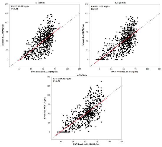 Models developed with the extended dataset consisting of 94 predictor variables, yielded substantially better results and a comparison of DNN models with RF models produced with the same data highlighted comparable predictive abilities (Table 3). Except for the no noise scenario, the R2 values were identical to RF models with six predictors [40] as well as models with 94 predictors and the RMSEs were in the same range. In terms of DNNs, the R2 increased from 0.42 (p-value < 0.001), 0.49 (p-value < 0.001), and 0.50 (p-value < 0.001), to 0.64 (p-value < 0.001), 0.66 (p-value < 0.001), and 0.67 (p-value < 0.001) for the daytime, nighttime, and no noise scenarios respectively. The RMSEs improved from 19.55 Mg/ha to 15.47 Mg/ha, 19.35 Mg/ha to 15.64 Mg/ha, and 19.82 Mg/ha to 16.09 Mg/ha with daytime, nighttime, and no noise scenarios respectively. The final neural network model for the daytime scenario consisted of 500 neurons in the first hidden layer and 160 neurons in the second layer. The regression model for the nighttime scenario also used two hidden layers with 300 and 200 neurons in the first and second layer respectively while the final NN structure for the no noise scenario consisted of one hidden layer with 500 neurons. For all the scenarios, a learning rate of 0.001 yielded the best results.