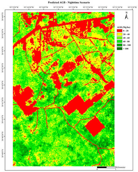 DNN predictions of AGB density at a 30 m spatial resolution for the nighttime scenario.