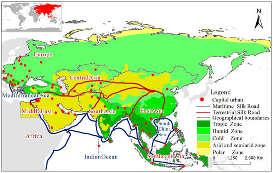 The spatial distribution of the different cities in the study area was determined based on geographical zones from the resource and environment data cloud platforms of China, namely, Central Asia (5 cities), South Asia (8 cities), East Asia (13 cities), the Middle East (19 cities), and Europe (20 cities). The cities in different geographical zones across the 65 countries along the Belt and Road are shown in Table 1.