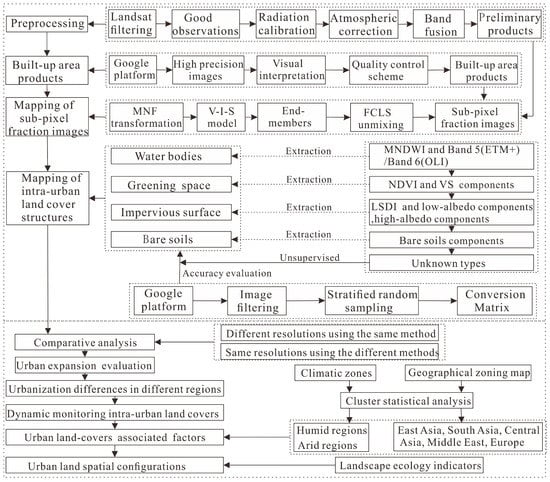 The synergistic intra-urban land-cover classification methodology of SMDU was created (Figure 2). First, all good-observation Landsat images were filtered from June to September during the period 2000–2015. The Landsat Enhanced Thematic Mapper Plus (ETM)+ and Operational Land Imager (OLI) images were processed to generate a 15 m preliminary product. A detailed description can be found in Section 2.2.1. Then, the vegetation-impervious surface-soil (V-I-S) model discriminated four optimal end-member objects, including bare soil object, vegetation object, low-albedo object, and high-albedo object. These four optimized end-member objects were put into the fully constrained least-squares solution model in order to generate four sub-pixel land-cover component images, namely, bare soil component, vegetation component, low-albedo component, and high-albedo component. The sub-pixel land-cover component images within cities were further acquired by overlying built-up areas. The multiple indices and decision tree classifier generated the majority of land-cover classification types. The remaining “unknown urban types” were further identified through unsupervised classification. All steps in this methodology were calculated according to the raster layers. A random stratified sampling (pixels) scheme was applied to quantify the accuracy assessment from historical archived Google Earth imagery. Then, the 15 m resolution urban land-cover product (i.e., the impervious surface area, vegetation, bare soil, and water bodies) across 65 capital cities along the Global Belt and Road was generated.