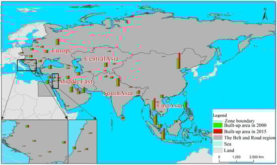Urban spatial expansion in each city for the years 2000 and 2015 along the Belt and Road. Notes: The height of the column represents the area of the built-up region in each city.