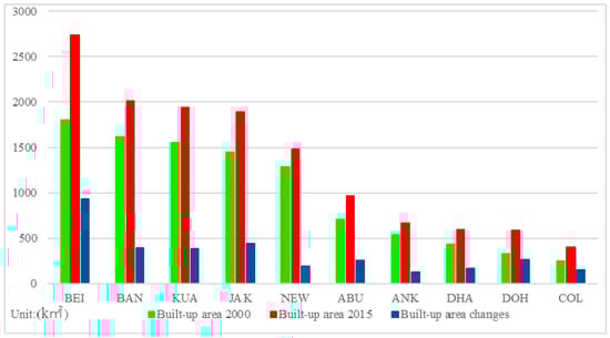 Figure 4 presents the top 10 cities with the most rapid urban expansion. Taken together, these 10 cities shared 59.52% of the total increases in urban expansion in 2000–2015. In particular, the top three cities, i.e., Beijing (China), New Deli (India), and Bangkok (Thailand) together (20.56% of the built-up areas in 2000) already contributed 31.68% of the total urban expansion. Overall, these results were important for urban studies, such as the forecast of urban growth in the future and rank-level urban comparison on regional and global scales.