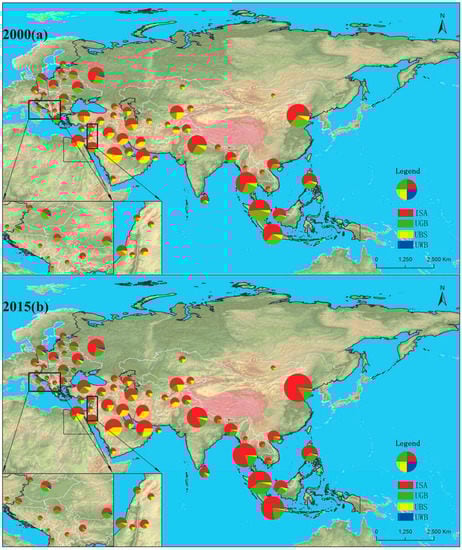 Intra-urban land-cover changes in 2000 (a) and 2015 (b) within the Global Belt and Road. Abbreviations: ISA, impervious surface area; UGS: urban green space; UBS: urban bare soil; UWB: urban water body. The circle size represents the built-up area in each capital city.