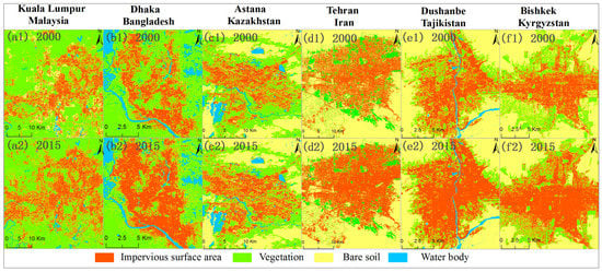 Examples of final classified intra-urban land-cover images. Notes: The description of the selected cities are as follows in the Figure 6. Kuala Lumpur, Malaysia, East Asia, coastal city, humid region; Dhaka, Bangladesh, South Asia, inland city, humid region; Astana, Kazakhstan; Central Asia, inland city with adequate surface water resources, arid region; Tehran, Iran, Middle East, inland city, arid region; Dushanbe, Tajikistan, and Bishkek, Kyrgyzstan, Central Asia, inland city, arid region.