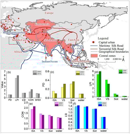 Urban landscape index features between 2000 and 2015 in the central zones. (a) Spatial distribution of the central zones within the Global Belt and Road; (b) for the landscape scale indicator, the values of PD, LPI, LSI, CON, and SHDI; (c) for the class scale indicator: the values of PD; (d) for the class scale indicator: the values of LPI; (e) for the class scale indicator: the values of CON; and (f) for the class scale indicator: the values of LSI. Abbreviations: PD: patch density; LPI: largest patch index; LSI, landscape shape index; CON: connectance index; SHDI: Shannon’s diversity index.