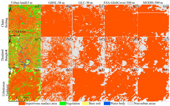Comparison of the urban land-cover classification results (i.e., urban land 15 m product in the epoch of 2000) obtained by this methodology and results from contemporary global products (i.e., global land-cover 30 m in the epoch of 2000, GLC 30 m; global human settlement layer 38 m in the epoch of 2000, GHSL 38 m; European space agency global land-cover data 300 m in the epoch of 2000, ESA-GlobCover 300 m; and moderate-resolution imaging spectroradiometer 500 m in the epoch of 2001, MODIS 500 m).