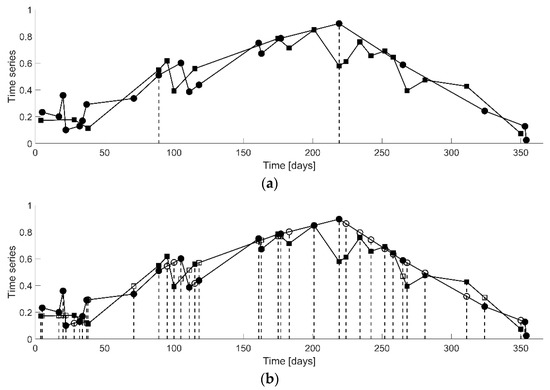 (a) Typical example of two time series observed by two different satellite sensors on the same area. The vertical dashed lines represent the two simultaneous observations. (b) The same curves after interpolation on the union of the dates (hollow circles and squares). The number of pairs increased to 38.