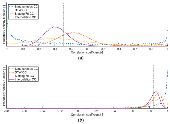 The correlation coefficient (or Pearson’s correlation coefficient) can be used for assessing the similarity between the two time series [10]. For paired observations (i.e., each observation is a pair of both quantities), the CC is generally estimated using the following estimator