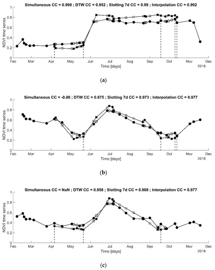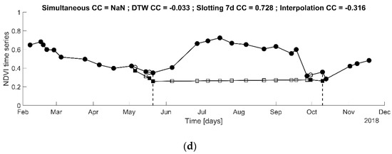 In this paper, we proposed to overcome the scarcity of the time series with a simple linear interpolation approach. The motivation is to obtain two time series with identical acquisition dates, so that the classical estimation of the CC is possible. We rely here on the CC because we are interested in the similarity between the time series (i.e., exhibiting the same patterns) compared to the more specific objectives of other existing indexes such as the index of agreement [10,11,12] where the values between the time series must be comparable in absolute terms (e.g., same average, same standard deviation,…). While the resulting time series are a mix of genuine observations and synthetic values, we think that an interpolation between two consecutive dates is a valid and natural approach at least for continuous processes (e.g., vegetation/crop monitoring). Indeed, it directly translates the cognitive mechanisms that the analyst uses when one visually compares the two time series on the same graph. We opted for linear interpolations in order to keep the method as simple as possible. However, experimental results showed that using a shape-preserving piecewise cubic interpolation did not bring significant changes (results not shown here). Alternatively, choosing more advanced interpolation methods (e.g., splines) might also be an option but there is a risk of adding artifacts in the interpolated time series [13].