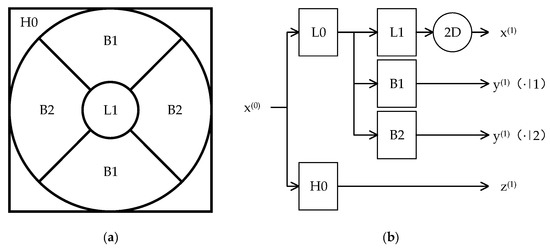 Frequency tiling and the corresponding system diagram. (a) Frequency tiling after the first level decomposition with P = 2. (b) The corresponding steerable transform. The frequency plane has been decomposed into three parts: a low-pass band, a high-pass band, and two oriented band-pass components. After the Steerable Pyramid (SP) decomposition, the approximation signal x(1), the high-pass signal z(1), and the band-pass signal y(1)(·|p) are obtained.