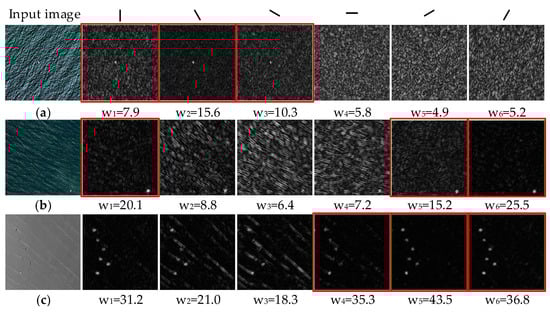 If the orientation parameter p is consistent with the direction of the sea clutter, the corresponding efficiency weight is lower compared to the weights of other orientation saliency maps. Given a set of orientation saliency maps with fixed scale s, we rank them in descending order according to their weights and then preserve the first three saliency maps denoted as for subsequent segmentation and region extraction. The remaining saliency maps are marked with red boxes, as shown in Figure 4. These saliency maps can detect the ship targets accurately, even in a highly cluttered background.