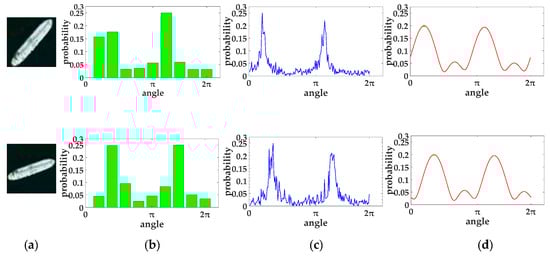 Simply, the HOG feature uses a discrete orientation histogram of an image to describe the shape of the object. In order to obtain the discrete orientation histogram, the gradient magnitude and orientation of each pixel in the image are calculated. Then, the angle range is quantified into several angle intervals. According to the gradient orientation of the pixel, the sum of gradient magnitude of all the pixels falling in the angle interval is counted. Finally, a discrete magnitude-weighted orientation histogram is formed to describe the approximate shape of an object. However, when the image patch rotates, the discrete orientation histogram changes in a complex manner (Figure 6b). Since the continuous orientation histogram is a period of orientation with a period of , can be expressed by using its Fourier series coefficients: