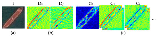 The scheme contains two stages: region proposal and ship target identification. In the region proposal stage, the luminance channel is decomposed using a steerable pyramid [29] with six orientations and five scales. The difference between the maximum and minimum output of each filter is used as a criterion for the efficiency of the generated saliency map. Then, some saliency maps that may be related to the direction of sea clutter are removed. Unlike other threshold-based methods, the graph segmentation algorithm [30] based on multi-scale saliency maps is constructed to overcome the problem of ship scale change and accurately locate candidate regions. In addition, by selecting efficient saliency maps, the region proposal algorithm can suppress the sea clutter to some extent. In the ship identification stage, the rotation-invariant HOG descriptor [31], using Fourier analysis in polar coordinates, is investigated to distinguish between the targets and the false alarms. Meanwhile, the main direction of the ship can also be estimated in this phase. The proposed detection framework achieves a good detection rate of ship targets in cluttered scenes. In general, our overall detection algorithm may become an effective contributor for improving the performance of the ship detection system.