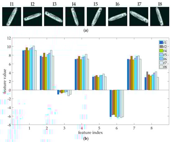 The demonstration of rotation-invariant features of the ship targets. (a) A series of patches with different angles denoted as Ik (k = 1,..,8). (b) Their corresponding output feature vectors fk. Note that only the first eight feature dimensions are shown in the bar chart.