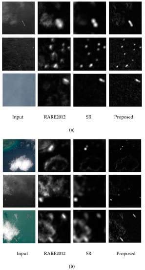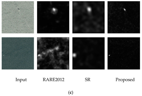 We can draw the conclusion that all saliency models can accurately extract ROIs in the quiet sea background, which verifies the effectiveness of the saliency models in extracting ROIs from the ORS images. When the background becomes complex (such as clouds, strong sea clutters, etc.), as shown in Figure 10b,c, the accuracy of all the saliency models in predicting the locations of the salient targets decreases. Nevertheless, our model has better robustness than the other two saliency models. It can be observed from Figure 11 that the RARE2012 model and the SR model ignore the finer details of the salient region, as both the methods calculate the saliency by adjusting the size of the original image. In addition, when the targets are close to each other, the two models merge different targets together, so that the accurate locations of the different targets cannot be obtained. Besides, compared with our saliency model and SR model, RARE2012 model performs poorly in suppressing the complex background. In general, our saliency model has the following advantages: