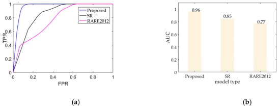 In quantitative evaluation, we plot the ROC curve and calculate the AUC value in Figure 11a,b, respectively. The saliency maps are binarized at each threshold within the range [0,255], the true positive rate (TPR) and the false positive rate (FPR) are computed with respect to the ground truth data. In the ROC graph, the TPR is plotted on the Y-axis, and the FPR is plotted on the X-axis. The AUC indicates how well the saliency map predicts the locations of the targets. The larger the AUC value is, the more accurate the prediction result is. Note that the proposed saliency model achieves the highest ROC-AUC performance. It can be concluded that our saliency model is more accurate than other methods.