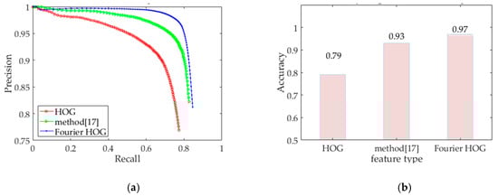 To demonstrate the feasibility of the Fourier HOG feature, it is compared with the HOG feature and another rotation-invariant feature used in method [17]. Specifically, the HOG feature characterizes the shape information by using histograms of orientation gradient. The rotation-invariant feature proposed by the method [17] describes the objects in terms of the shape and texture information. The three different features are combined with the linear SVM classifier and use the same dataset for training and testing. We employ the precision-recall (PR) curve and the classification accuracy to quantitatively measure the performance. The classification accuracy is defined as the ratio of the number of correctly classified samples to the total number of tested samples. A comparison of the PR curve is shown in Figure 13a, and the classification accuracy is presented in Figure 13b.