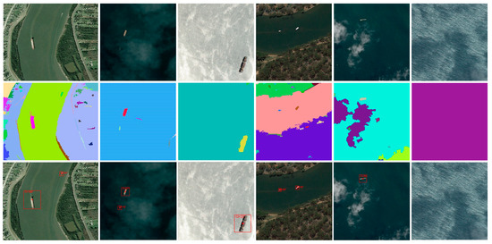 According to the detection results of the first stage, although our region proposal algorithm achieves high false ratio, it guarantees the detection accuracy. Next, after the target identification stage, a large number of false alarm targets are removed, and real ship targets are retained. Some typical detection results are displayed in Figure 14. The detected ships are marked with the red boxes.