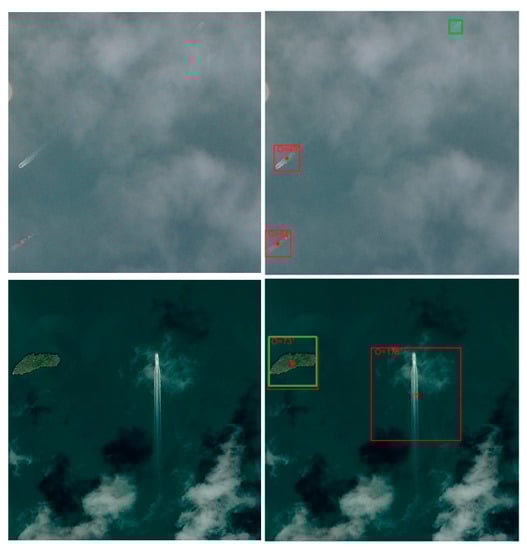 Two failed detection examples. Due to the small target size and low resolution of the ship, missed detection marked with the green box occurs in the first row. In the second row, due to the shape of the island similar to that of the ship, false detection marked with the green box occurs.