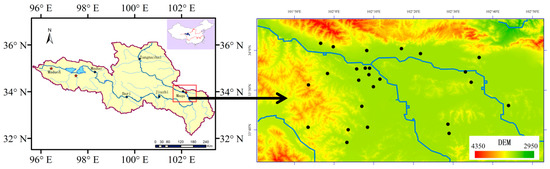 The vegetation type (Figure 2) in the entire source region of the Yellow River is dominated by grass with sporadic shrubs on the plateau, which are characterized by a uniform land cover of short grassland used for grazing by sheep and yaks. The terrestrial pattern can be identified according to the digital elevation model. Sporadic shrubs dominate the areas in the top and middle elevations above 4200 m.